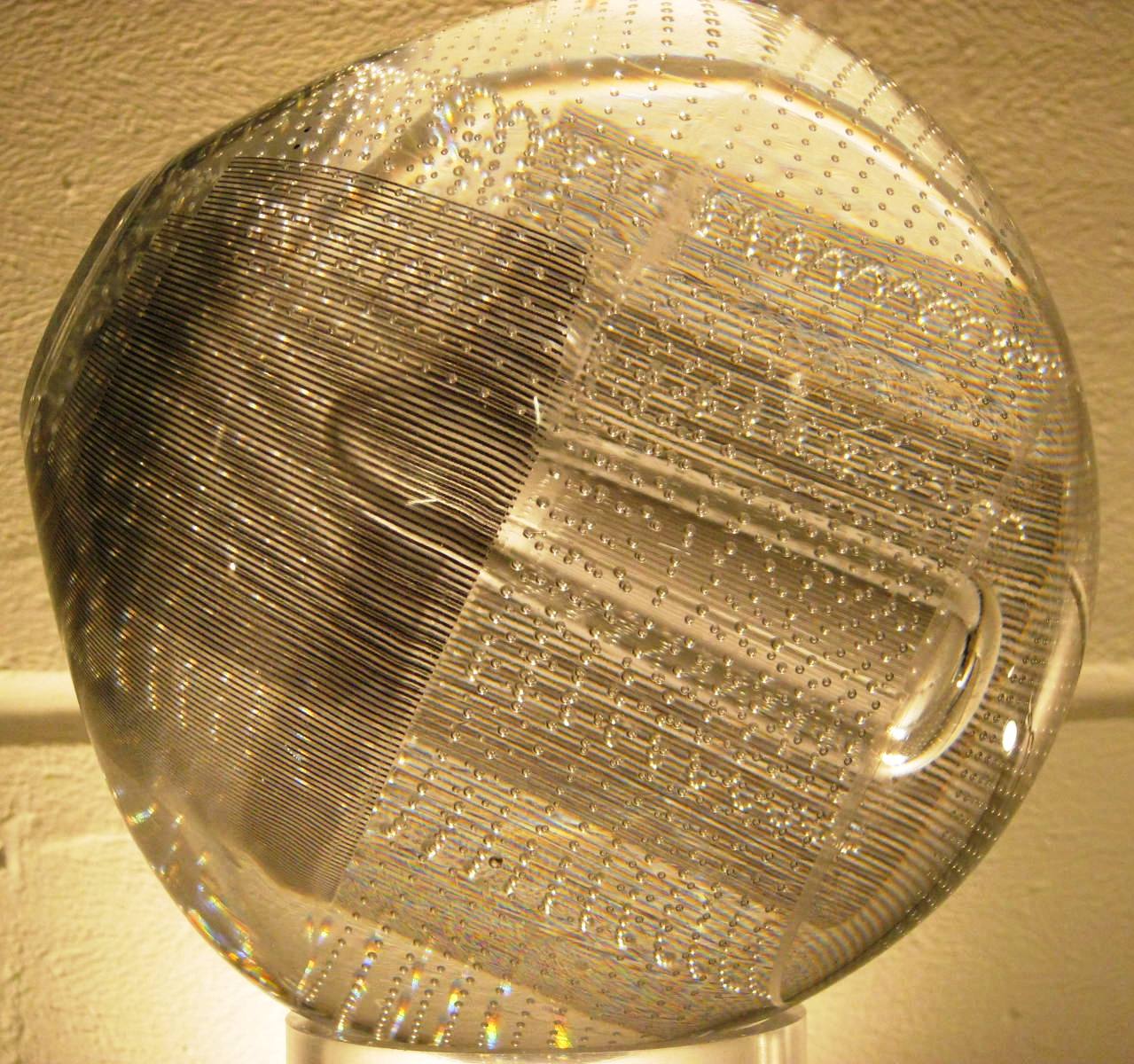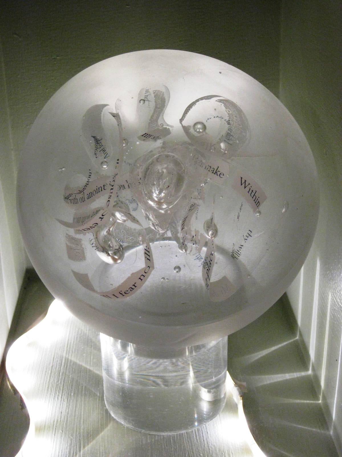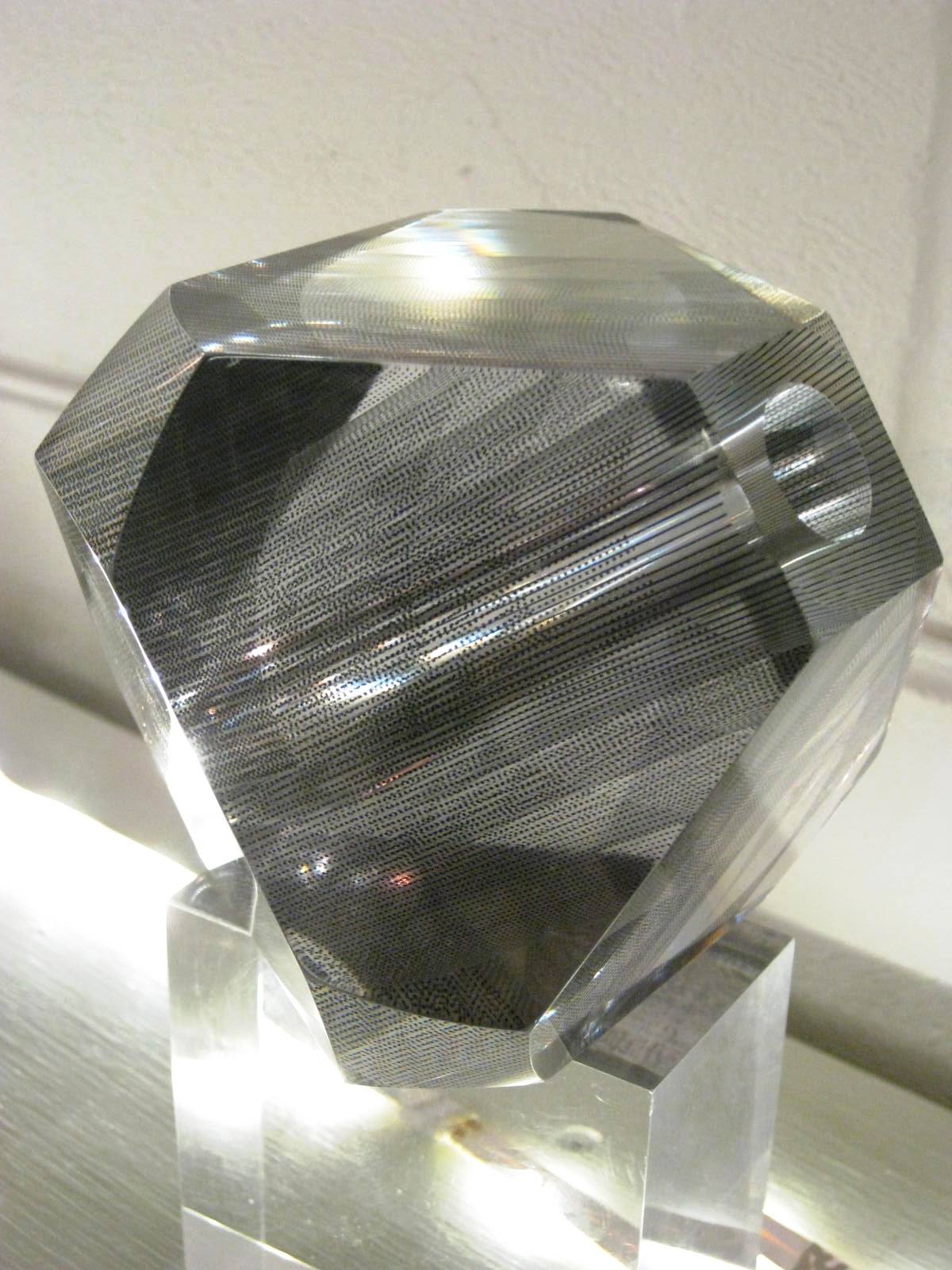 A maker I hadn’t met before showing at Cockpit was Shelley James and there was no way I couldn’t stop after seeing these glass pieces. The one below contains a poem, the strips of text legible according to the angle of the ball.